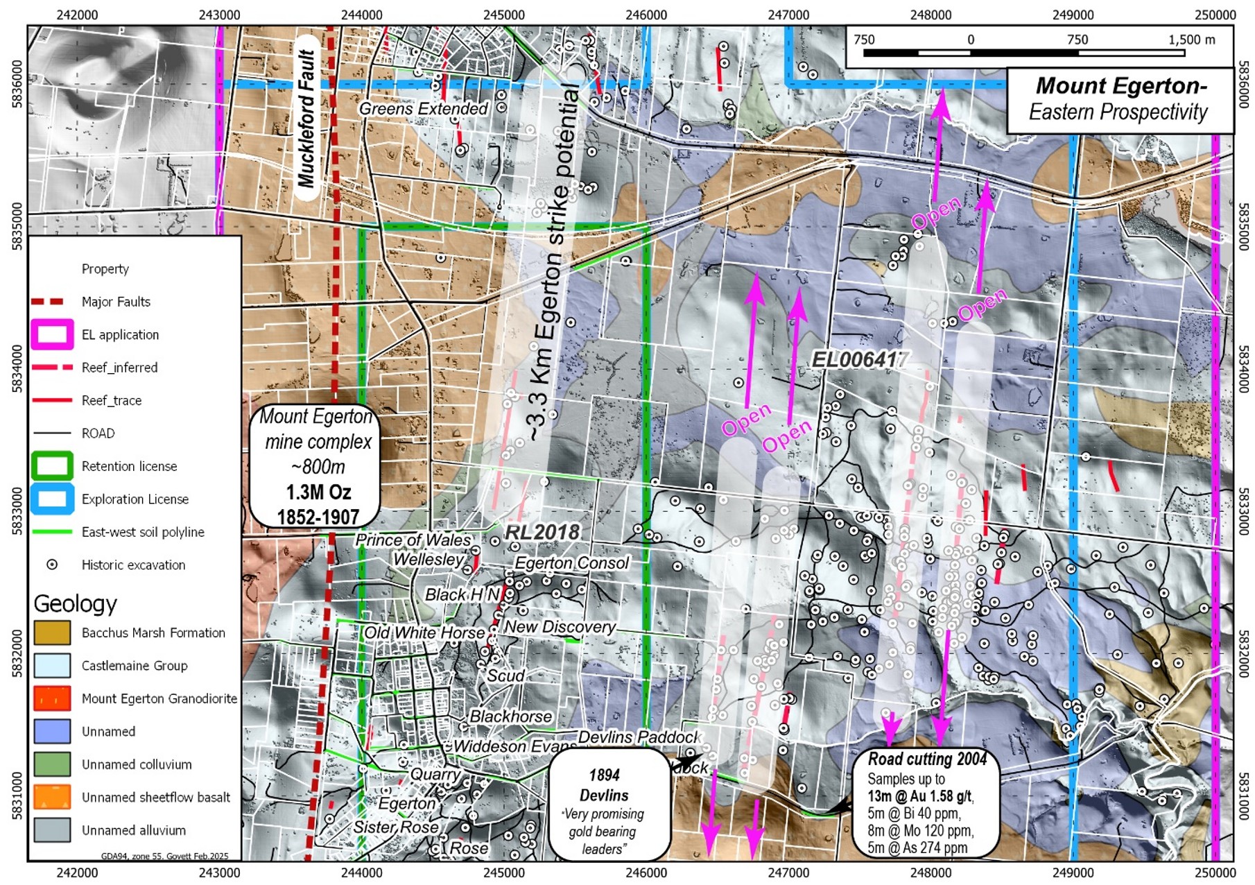 Mount Egerton eastern prospectivity. Surface geology and property boundaries draped over LiDAR. Shallow historic workings inferred from LiDAR and historic records of exploration annotations.