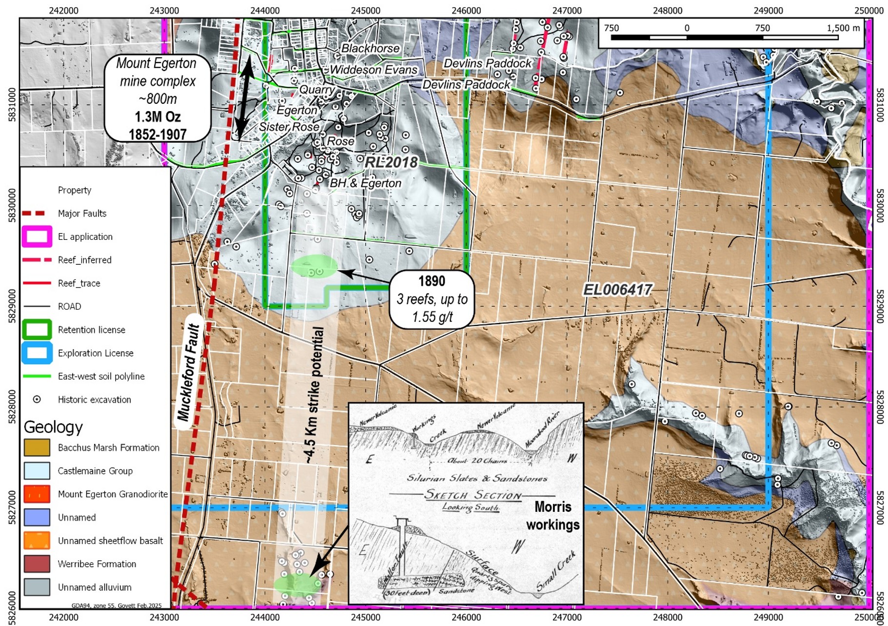 • Morris’s Paddock, ~4.8 km south, a small underground shaft was developed in auriferous drift and gravel near the margins of the Newer Volcanics.